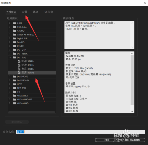 第三步,就会看到呈现新建的框,序列预设不消改,默认即可