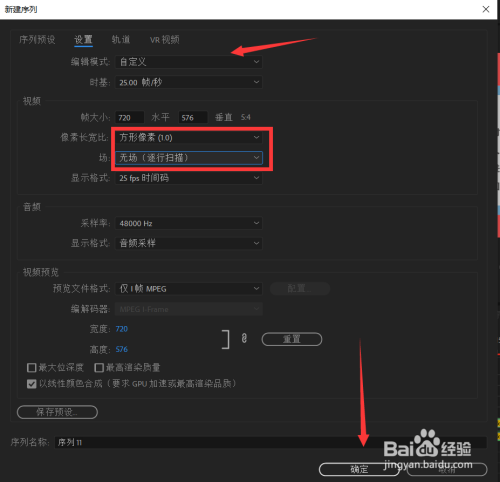 第四步,再点击设置,编纂模式:自界说,下面改当作方形像素和无场【弥补尺寸常识点:720×576(4:3比例)、1080×720是高清、1920×1080是超清】