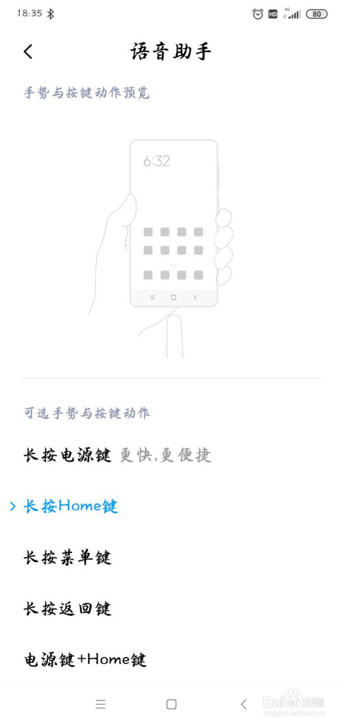 好比,点击“按键叫醒体例”,可以看到系统供给了多项叫醒语音助手的体例,这里我们选择“长按Home键”;