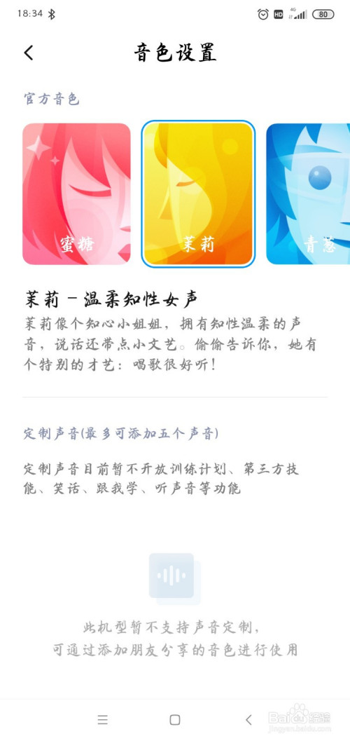 而点击“音色设置”选项,可以选择分歧的智能语音设置,好比“蜜糖”、“茉莉”、“青翠”等。待所有选项都设置完当作后,回到手机本家儿页面,长按Home键就可以打开小米手机语音助手,就可以实现人工智能通话了!