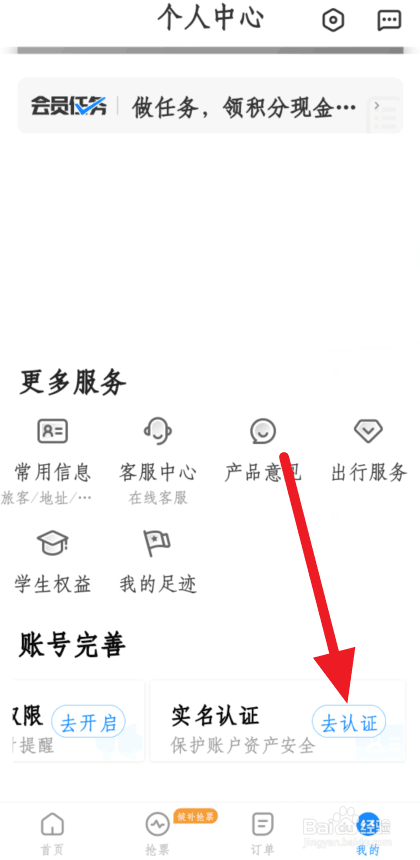 进入小我中间,点击账号完美下的去认证。