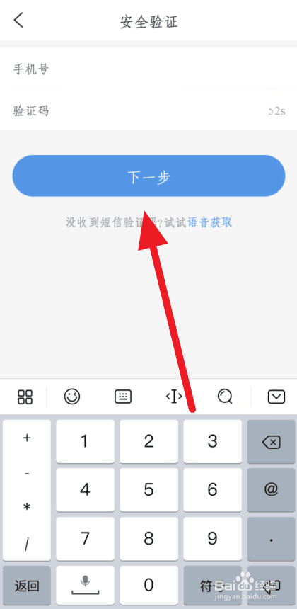 进入平安验证页面,输入手机号和验证码,点击下一步。