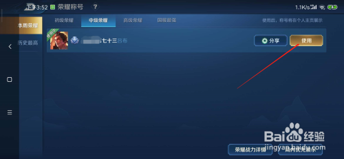 4.必需先获得荣耀称号,然后点击利用。设置完后,利用该英雄进入游戏对战就可以显示出来了