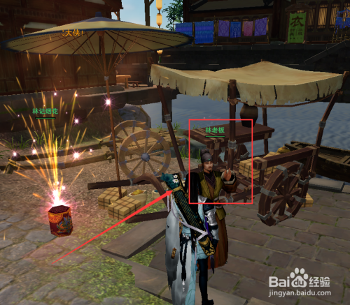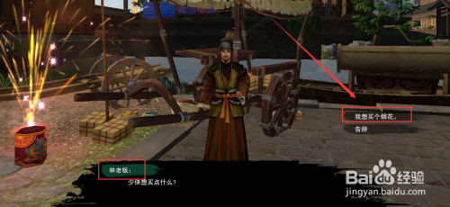 然后我们飞到再来镇的来字红框处,找到【炊火店掌柜林老板】,与他对话,花30金币采办一个烟花。