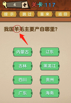 最强的大脑第117关:我国羊毛本家儿要产自哪里?谜底【羊】身上。点击标题问题中“羊”字