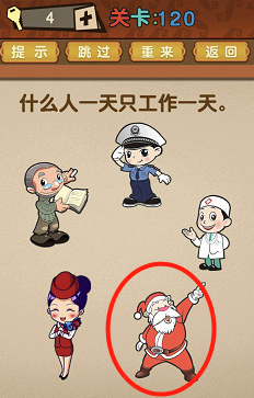 最强的大脑第120关:什么人一年只工作一天?谜底【圣诞白叟】因为一年只有一次圣诞节哟