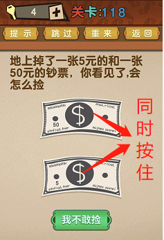 最强的大脑第118关:地上失落了一张5元的和一张50元的钞票,您看见了,会怎么捡?谜底【两张一路捡】将两个手指头同时按在两张钞票上