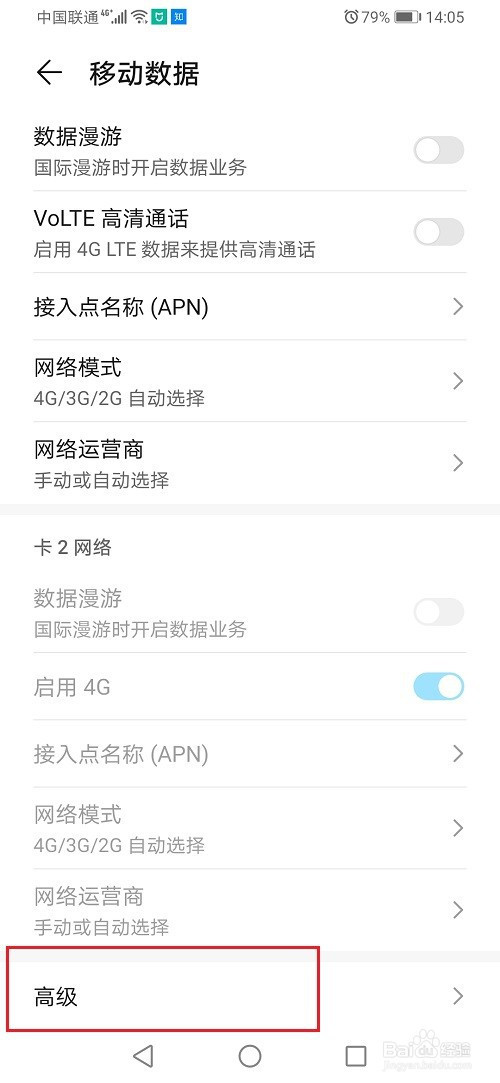 第三步在移动数据中,点击高级