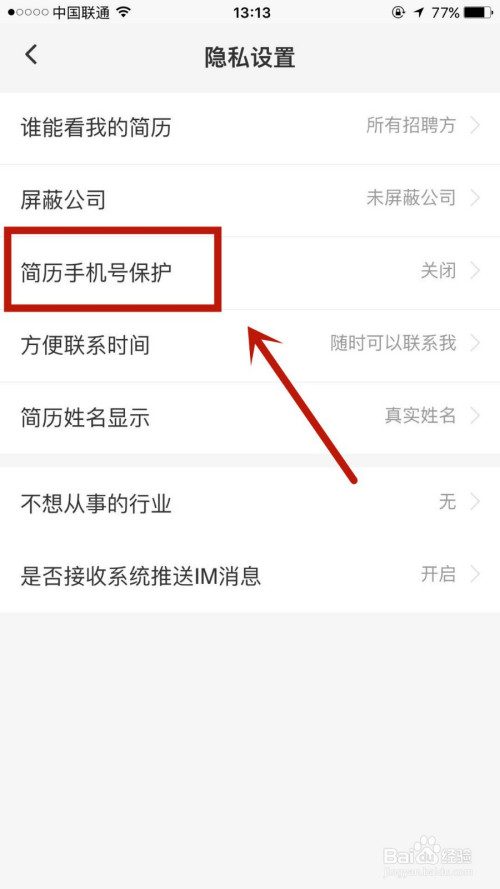 在隐私设置页面,点击进入简历手机号庇护选项。