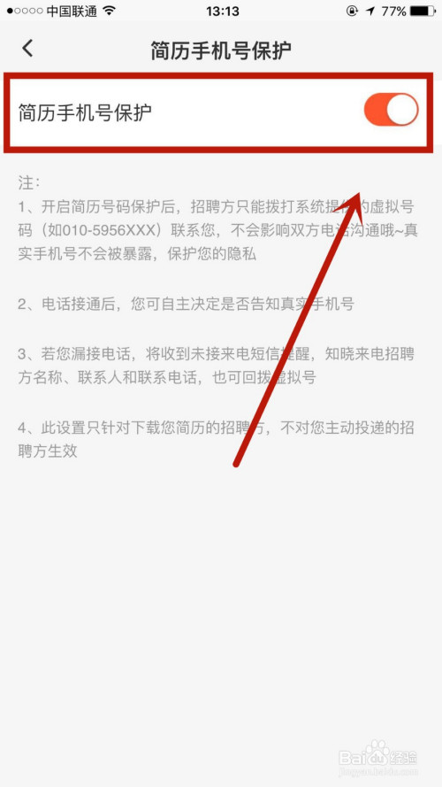 3.进入简历手机号庇护,将简历手机号庇护后的按钮点击打开,即可当作功操作。