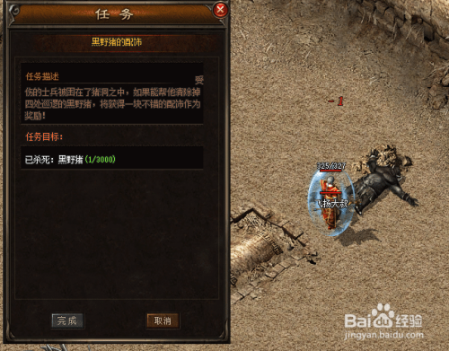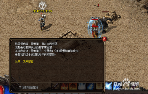 传送到野猪洞,跑到二层,地图右上方有个绿点,NPC受伤的士兵(坐标:328,88)