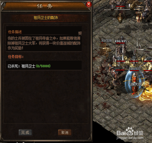 传送到祖玛寺庙,跑到五层,第一圈左上角落有个绿点,NPC受伤的士兵(坐标:69,98)