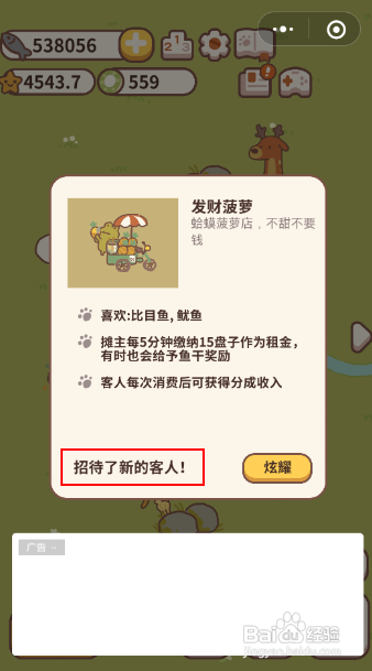 放入鱼之后,可以当摊本家儿,再经由过程【招待新客人】让客人进行摆摊了,收取盘子为房钱分当作。
