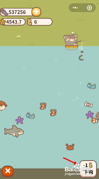在进入鱼塘,点击右下角的【下钩】耗损鱼饵,进行垂钓。
