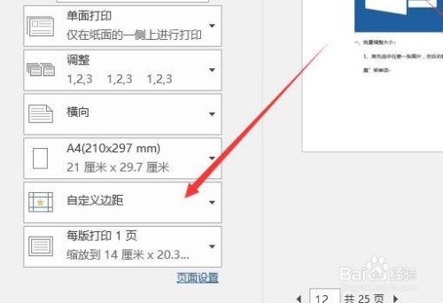 在右侧打开的打印窗口,点击自界说边距的下拉按钮。