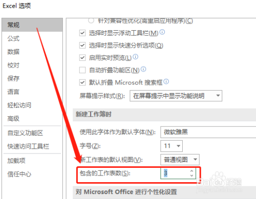 在“新建工作表时”中,设定包含的工作表数。如图: