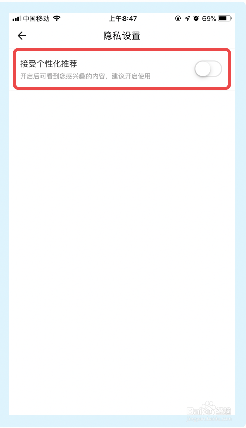 5.点击【接管个性化保举】选项,完当作以上步调自如app即可封闭接管个性化保举功能。
