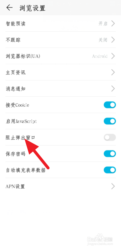 进入浏览设置页面,找到阻止弹出窗口功能。