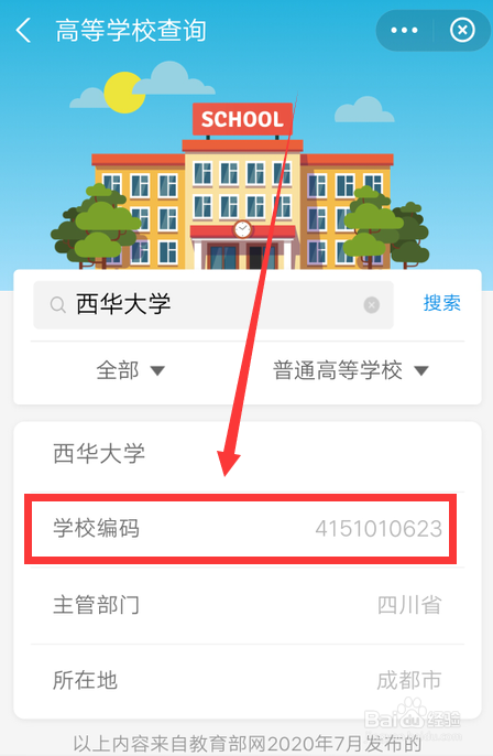 输入西华大学后,就可以查询到该黉舍的代码了,如图所示