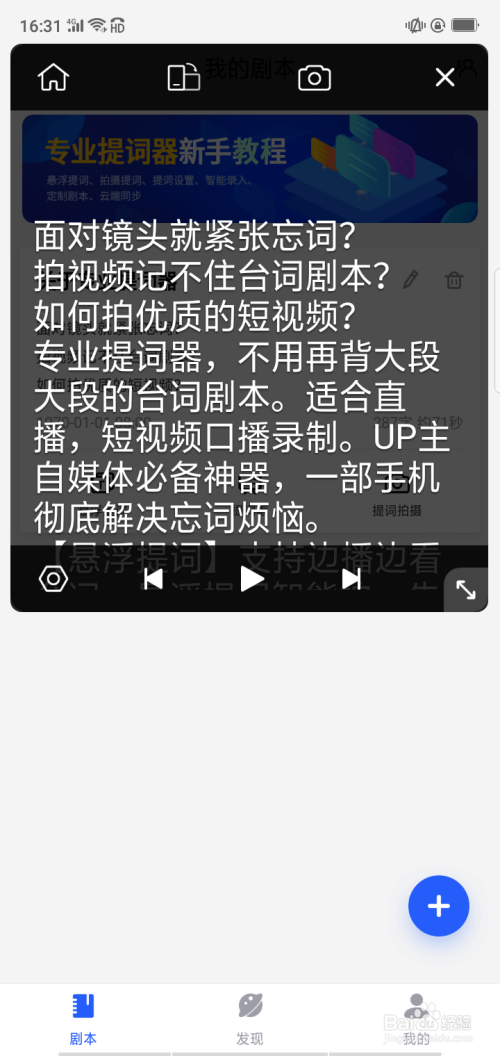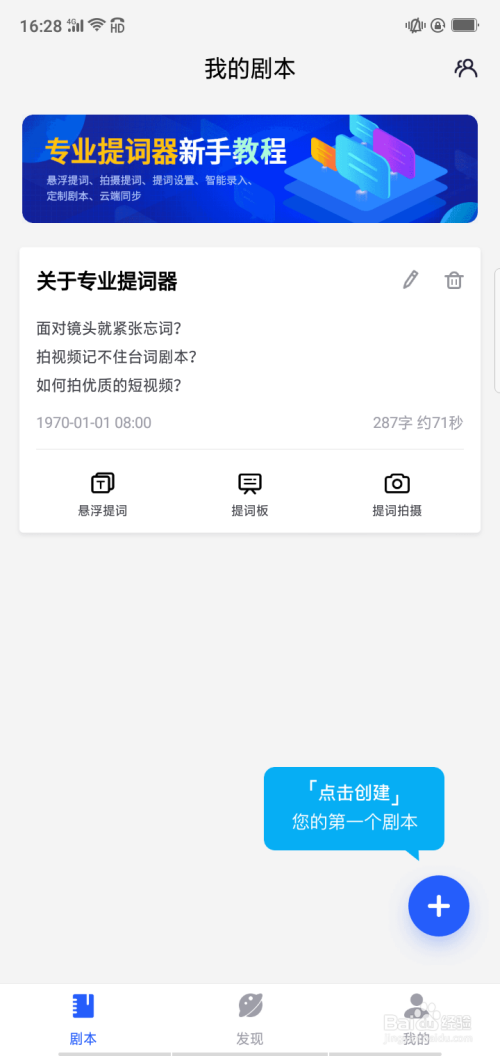 第二步、打开专业提词器app,此刻脚本里空白的,这时需要点击脚本中的“+”按钮添加脚本。