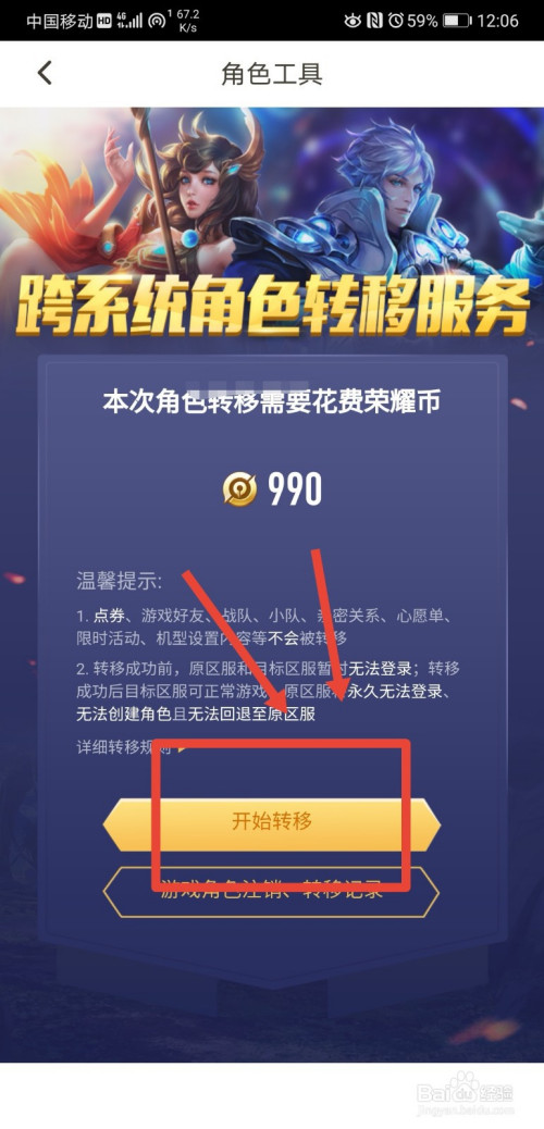 在脚色东西页面,即可继续账号转移操作,账号转移需要支付990个荣耀币,详情如下;
