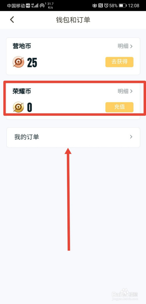 在钱包订单页面就有荣耀币充值进口了,我们点击重充值即可。