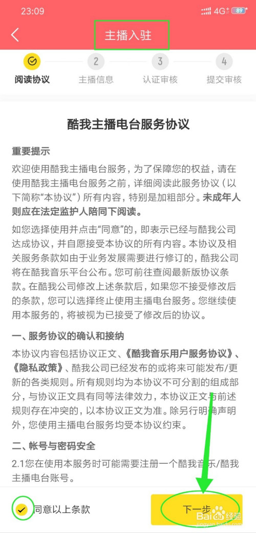 第四、进入到本家儿播入驻页面,首先要赞成酷我本家儿播电台办事和谈;