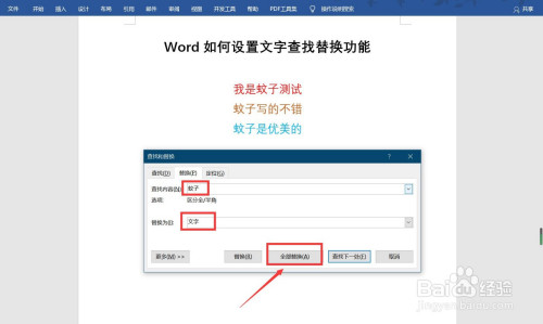 输入查找的内容(蚊子)与要替代的内容(文字),点击全数替代(如图所示)
