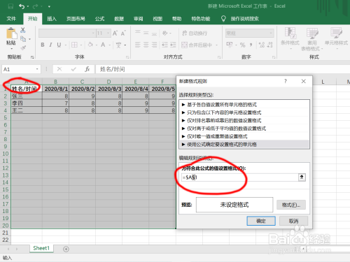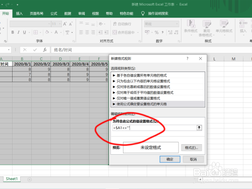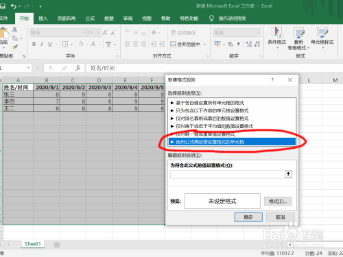 在弹出的对话框中,选择“利用公式确定要设置格局的单位格”;