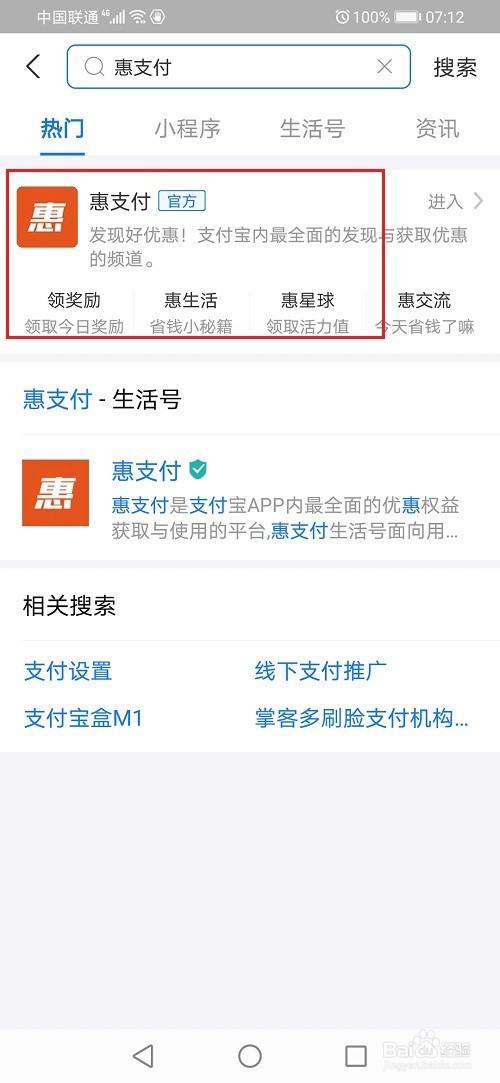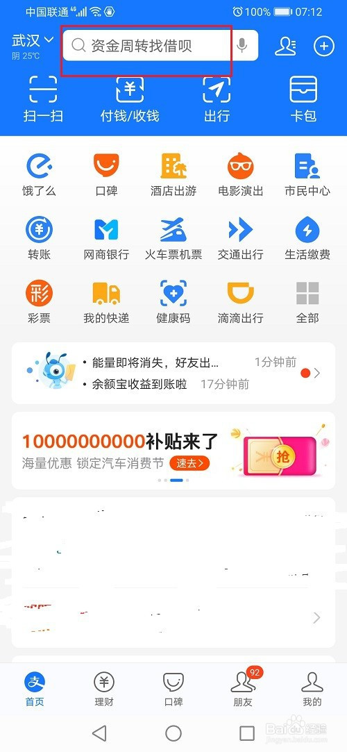 第二步下面来利用一下支付宝惠支付,打开首页,点击搜索框