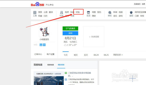 在电脑浏览器中登录百度账号,在小我中间界面点击“经验”。