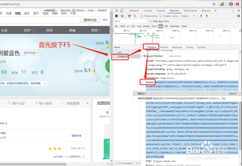 然后按下“F5”刷新界面,选中“content”然后选中“Headers”找到Cookie,复制Cookie的值。