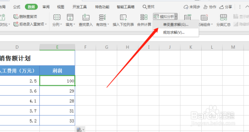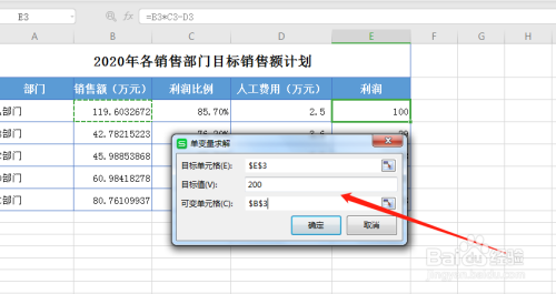 假设方针利润需要达到200,则输入200,再选中可变单位格,最后确定即可。