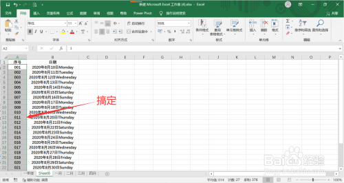 6、这样就输入了数值型的001格局序号