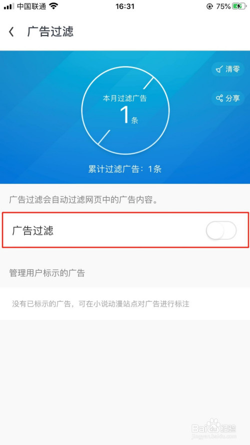 在“告白过滤”界面中,勾选“告白过滤”选项的勾选开关,这样就可以打开UC浏览器的告白过滤功能了。