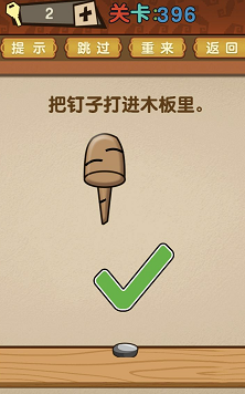 最强的大脑第396关:把钉子打进木板里。谜底【眼疾手快,一击即中】找准机会把钉子打进木板里