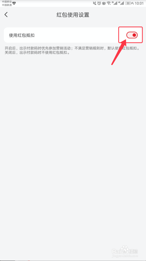 在【红包利用设置】中,点击【利用红包抵扣】右侧的开关按钮,如下图所示。