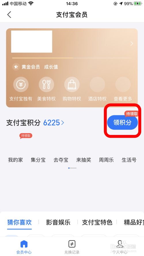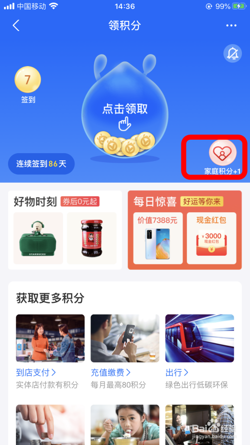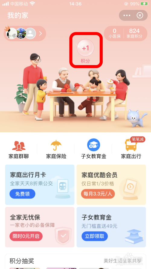 跳转家庭页面,点击【家庭积分】完当作领取;
