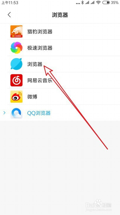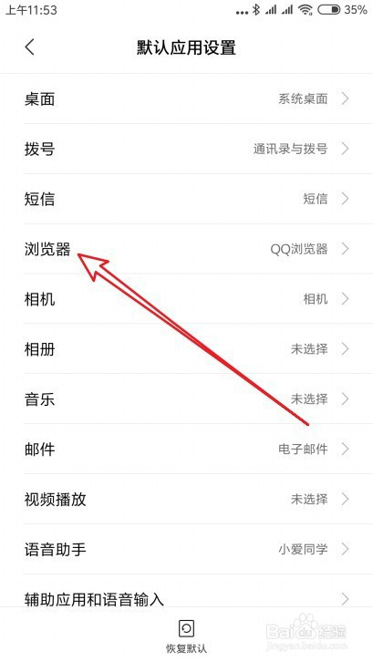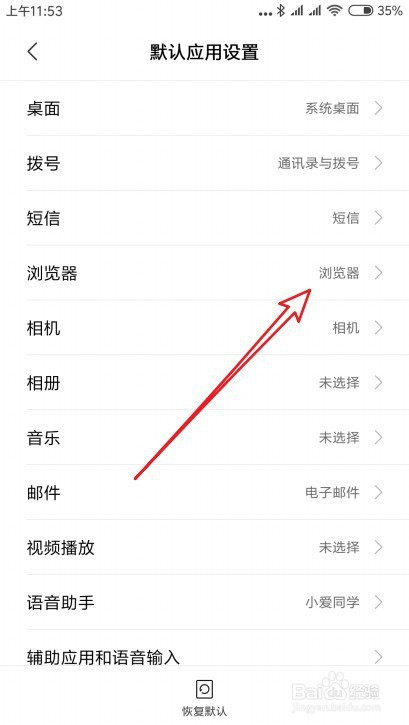 然后在打开的默认应用设置列表中,点击浏览器的设置项。