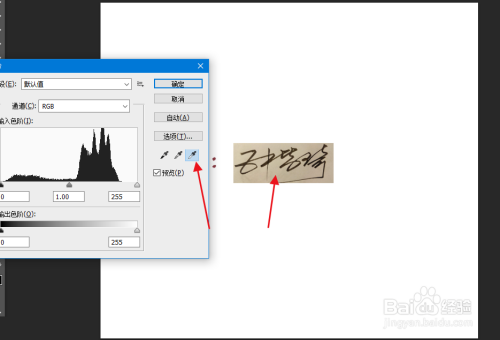 然后按住快捷键CTRL+L,打开色阶,点击淡色吸管,再点击签名图片中的空白区域。