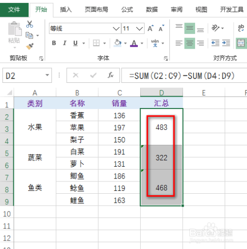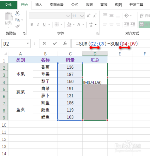 接着,输入公式:=SUM(C2:C9)-SUM(D4:D9),具体如图所示: