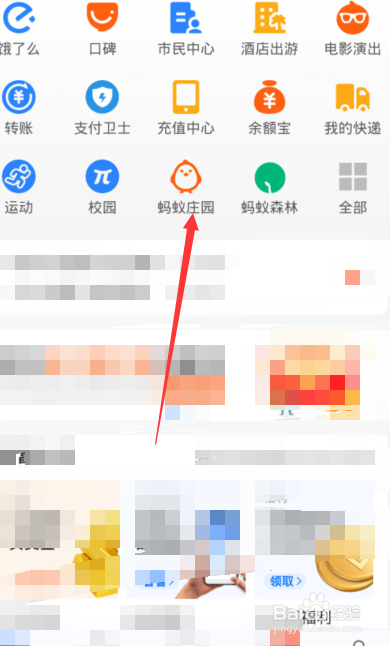 1、支付宝首页点击蚂蚁庄园选项按钮。