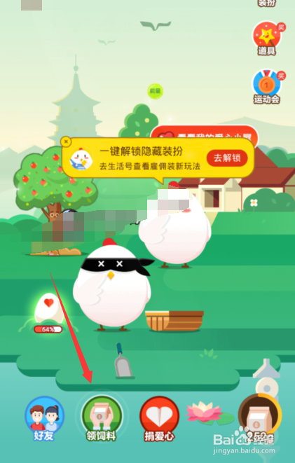 2、进入蚂蚁庄园点击领饲料选项按钮。