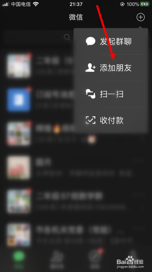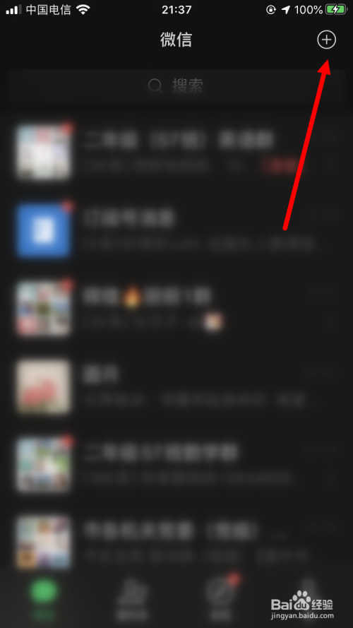 首先在手机上打开并登岸微信,并在首页面点击右上角的【+】。