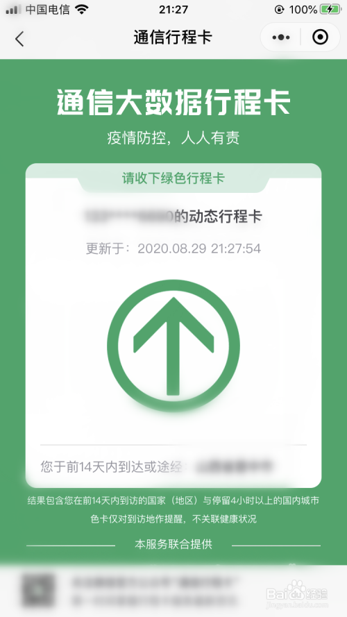 9、这样就查询到了本身的行程码,显示14天内达到或路子的城市。