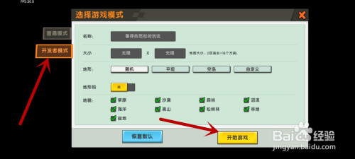 首先我们要建立一个【开辟者模式】,设置好大小、地形、地貌后再起头游戏。