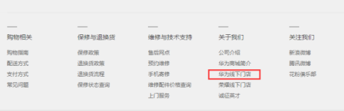 1、登录华为商城,并将页面拉倒最下方,看到如下选项,可选择线下门店。