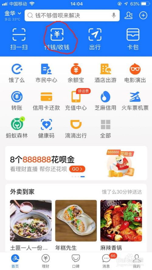 第一步,打开手机支付宝首页,打开红色圈圈里的 收付钱