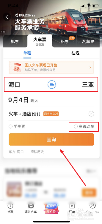 点击设置地址城市、勾选高铁动车并点击【查询】