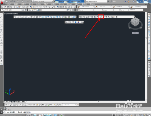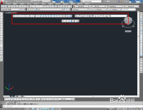 鼠标右键点击图示箭头所指区域,点击【AutoCAD】,依次勾选【建模】、【视图】以及【视觉样式】东西栏;